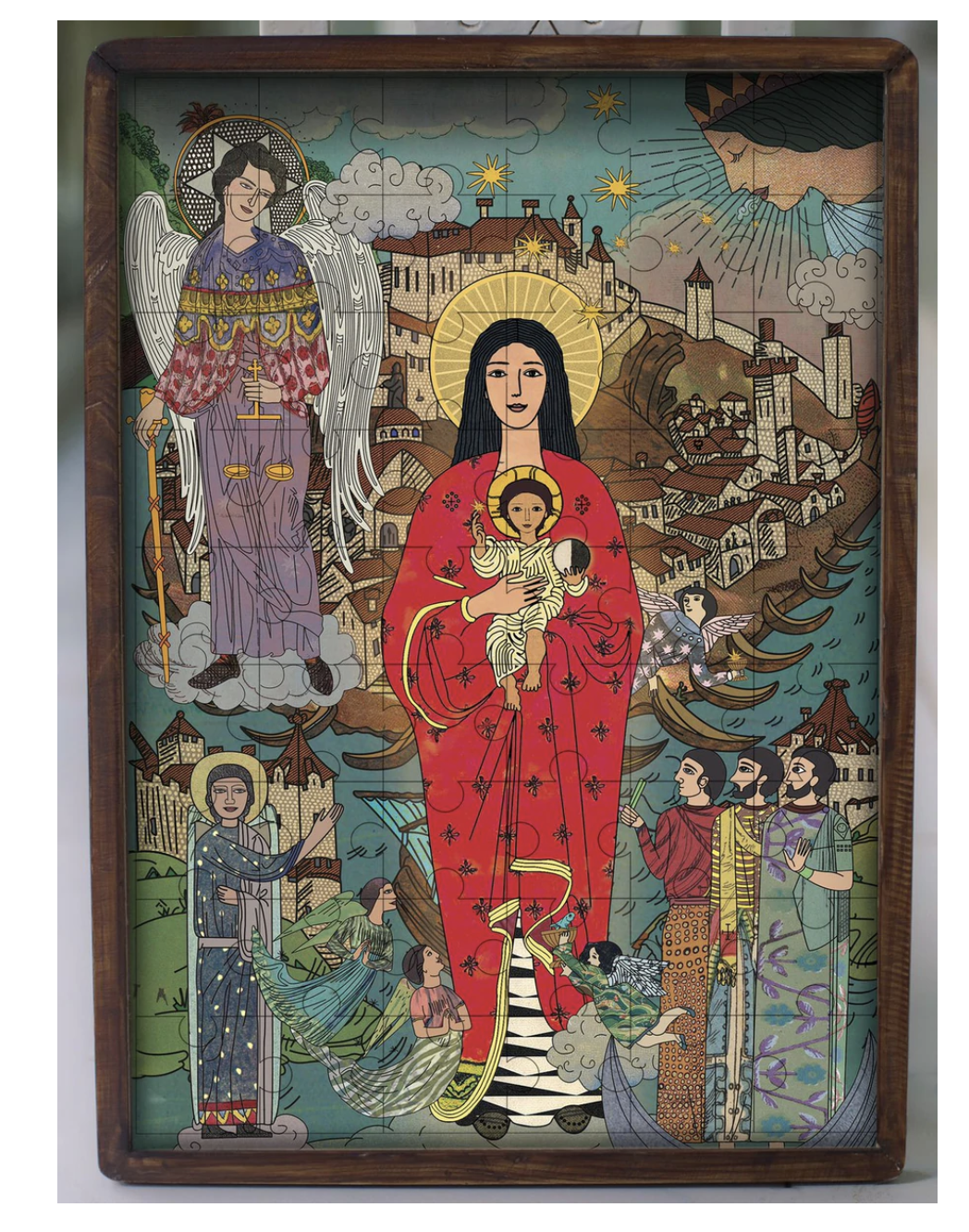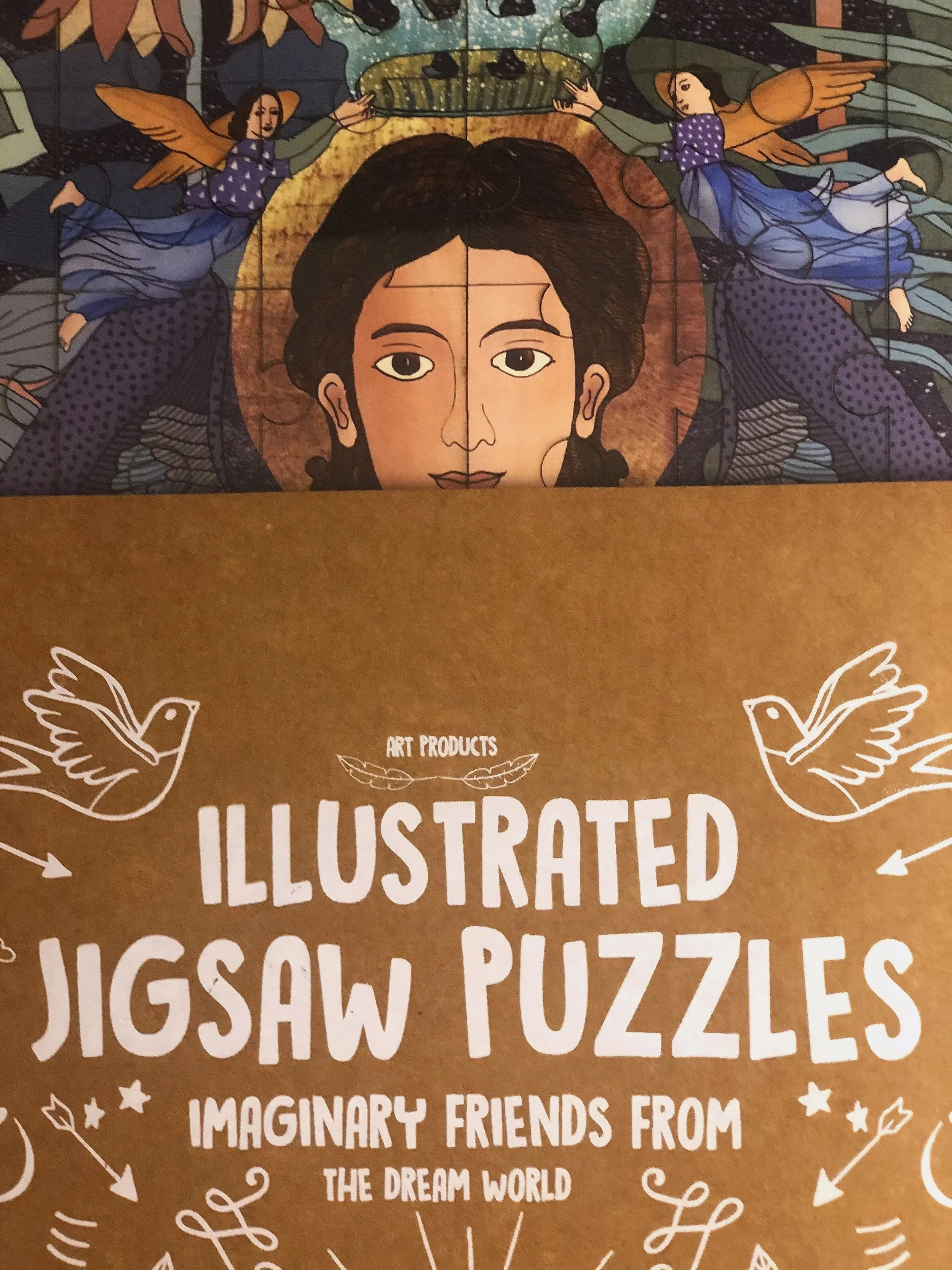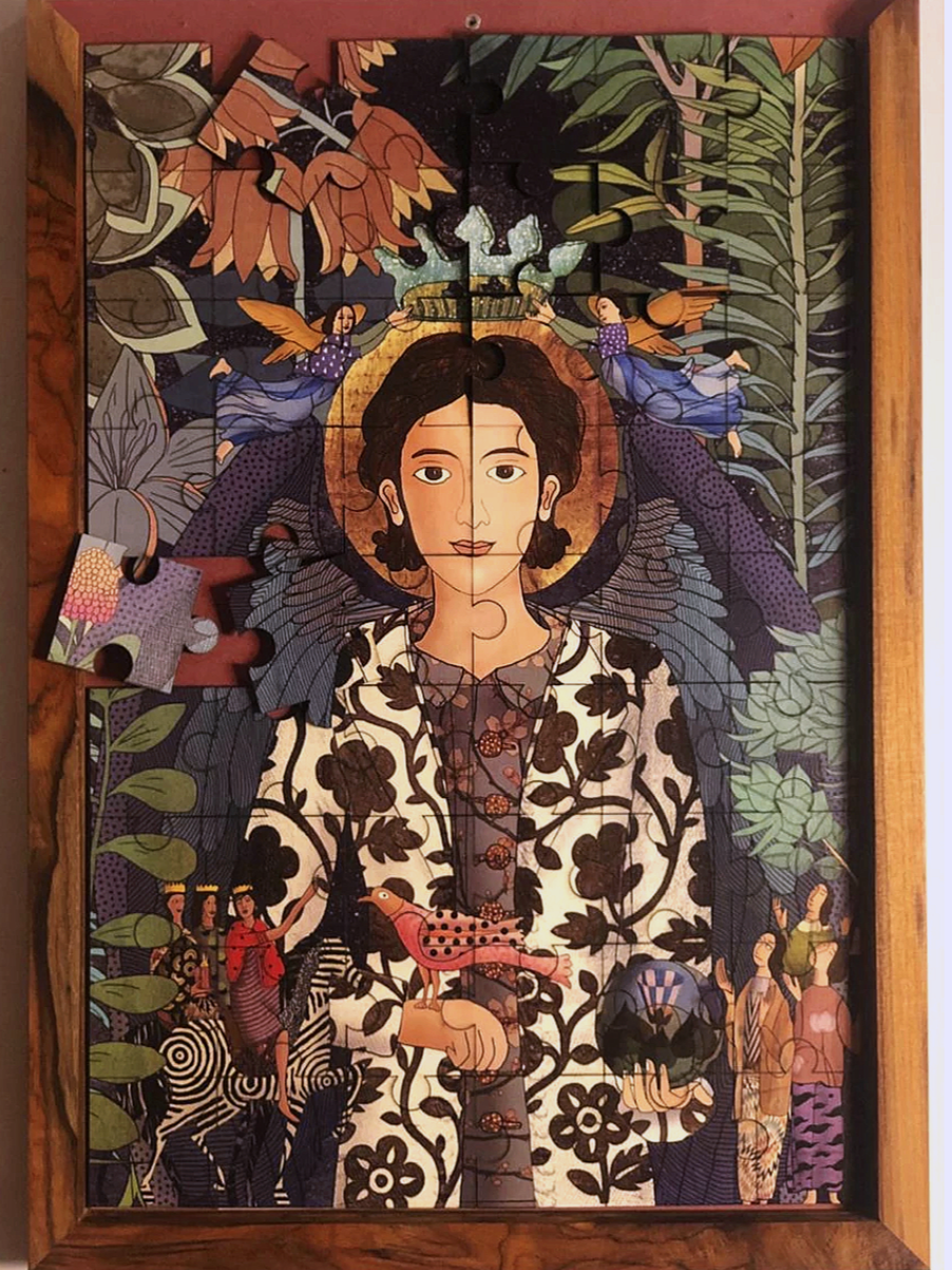 The 48 piece framed art puzzles are portraits of imaginary characters meant to open a door into the world of characters and landscapes that operate by their own logic, where the laws of the waking world do not quite apply. The teakwood frame arrives as a tray — a contained field in which , the image emerges piece by piece. When the last piece is placed, the tray becomes a framed artwork.