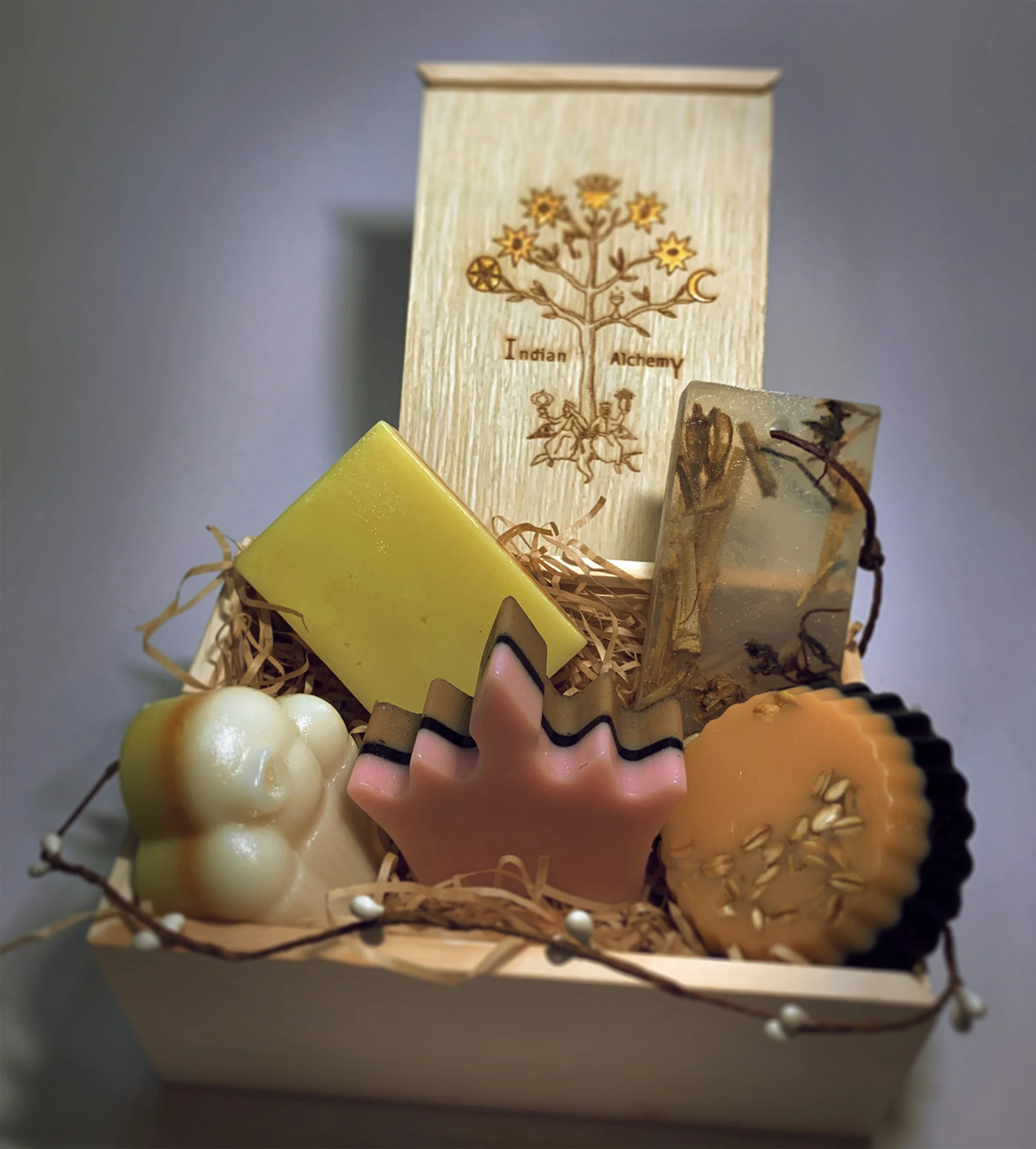 A detoxifying shea butter soap with coffee grounds, cinnamon, charcoal and vanilla. An activated charcoal bar with orange, spearmint and cinnamon. An ambrette seed soap, rich and exalting, with lavender and Himalayan cedarwood. Each comes wrapped in the hand-drawn Indian Alchemy tree — a mystical diagram of stars, moons, keys, and alchemical symbols that is unmistakably Ruchi's hand. The wooden gift boxes, laser-engraved with the same motif, are objects in themselves. Indian Alchemy has a small and devoted following who describe it simply: once you have used it, nothing else will do.
