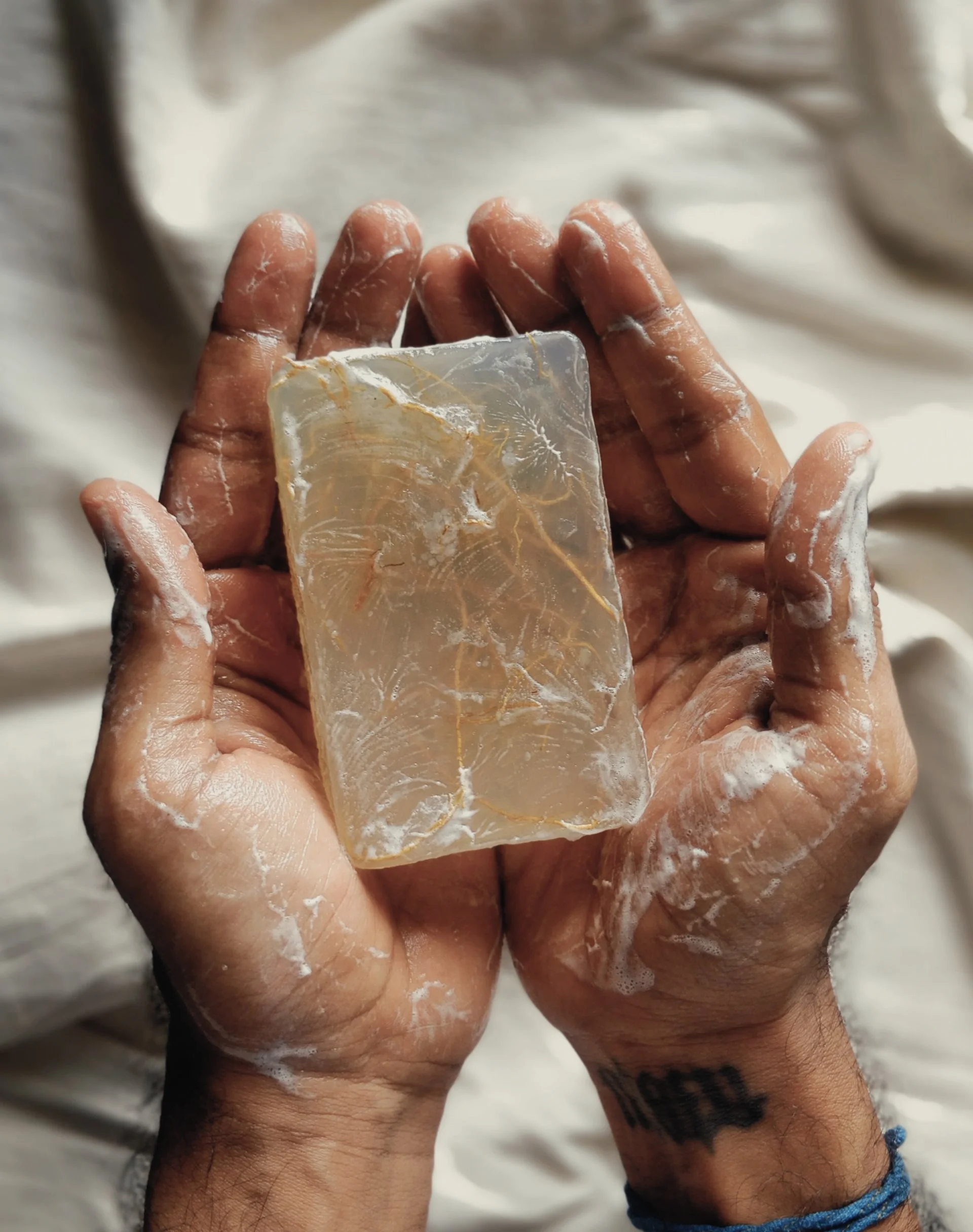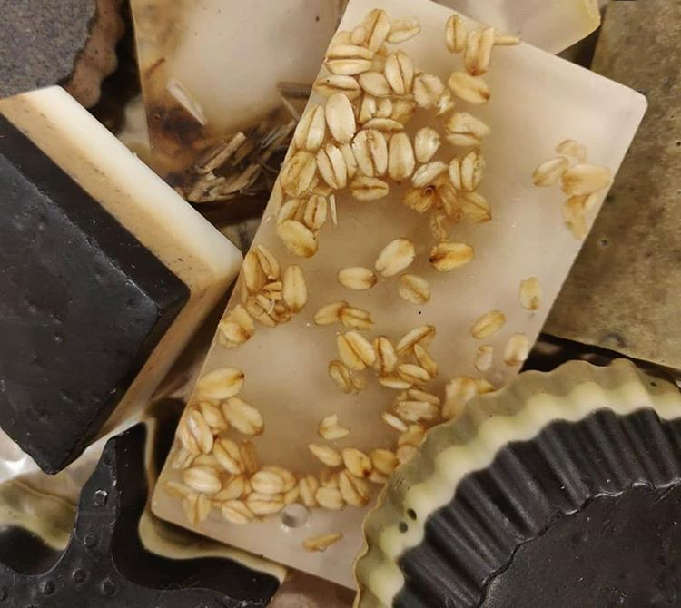 During the lockdown years, Ruchi and Sanjeev started one more thing in the Aksa studio: a kitchen lab. Indian Alchemy produces handcrafted soaps — five distinct varieties, each made by the women of Madh Island from therapeutic-grade essential oils, plant-based butters, fruit enzymes and botanical embeds. A goat milk bar with turmeric, tea tree, frankincense and rosemary. An aloe scrub soap with lavender, lemon, patchouli and embedded herbs — translucent, with roots and botanical matter suspended inside like something preserved in amber.