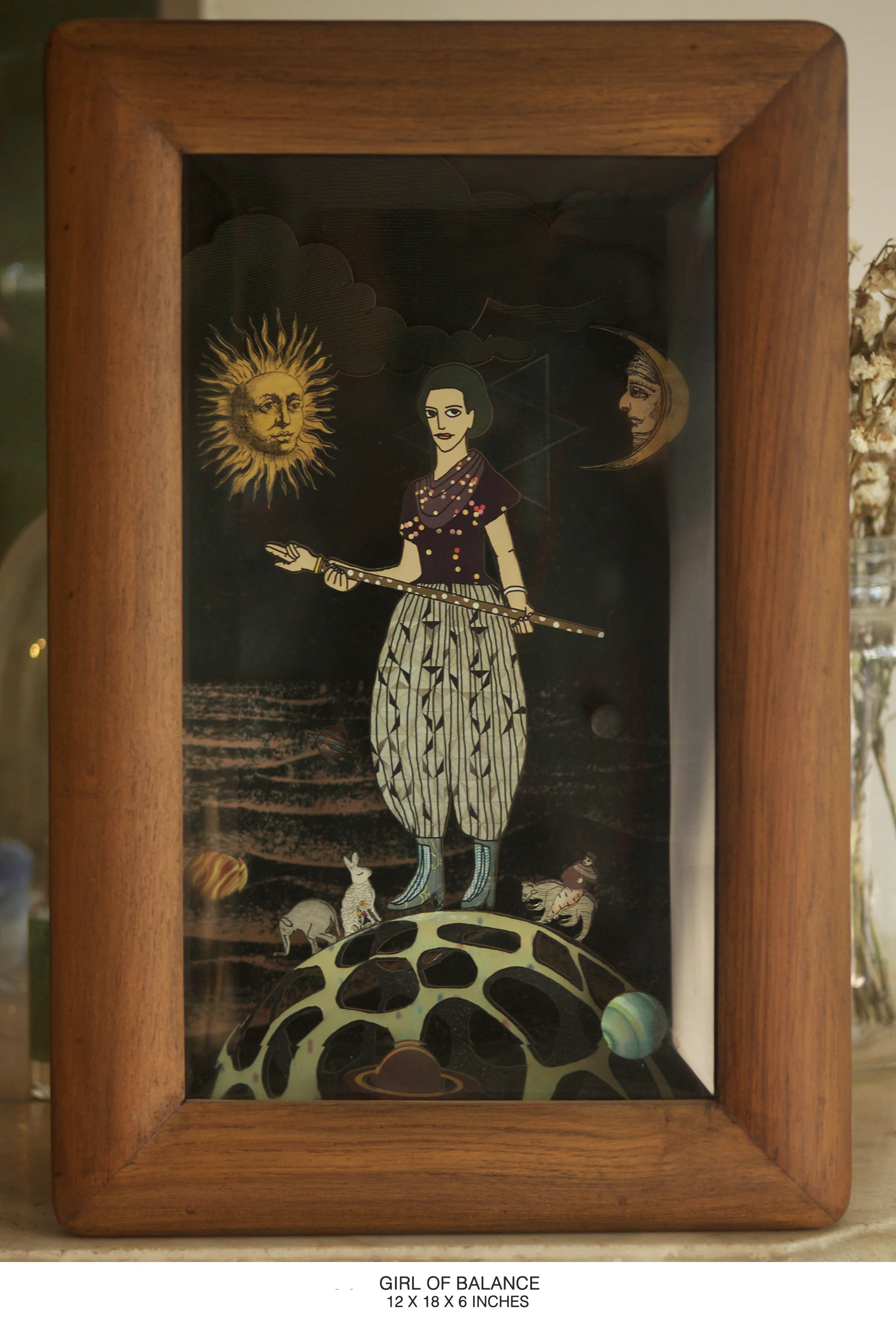 A Shadow Box is like a personal shrine, a multilayered collage of treasured and meaningful images set on lasercut acrylic in an artistic assemblage. These boxes are like little story worlds in themselves, intriguing and playful rabbit holes inside everyday reality