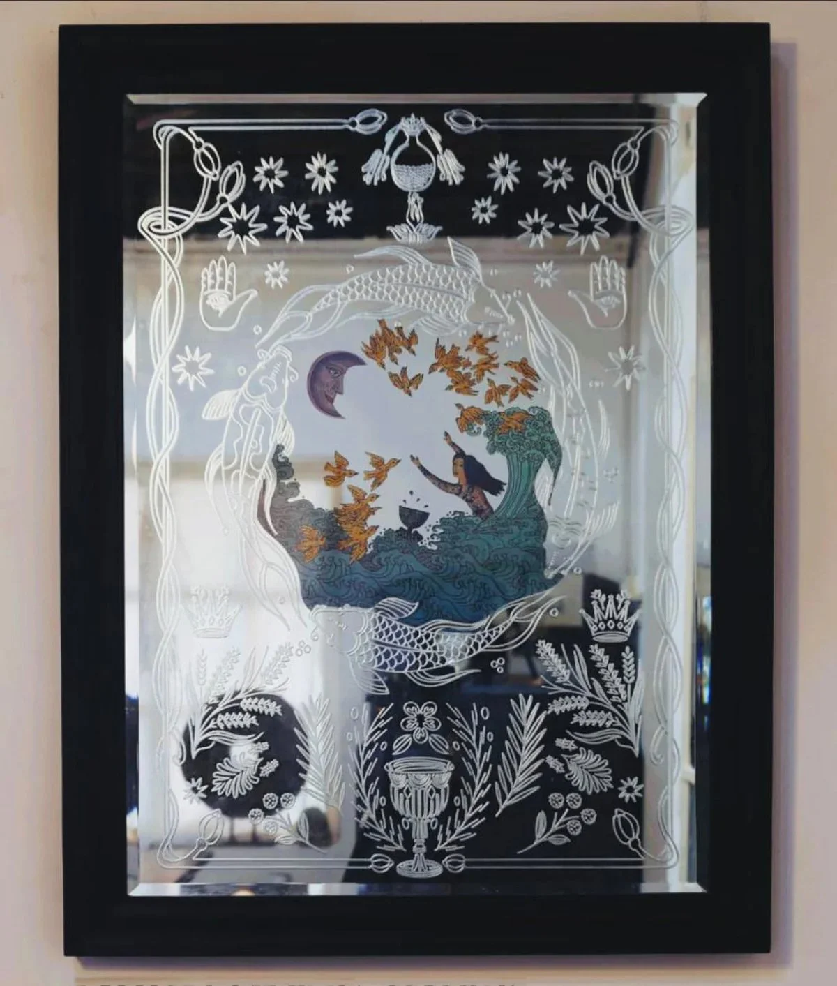 Medium: Silvered mirror, Engraved and etched glass, print on acid free archival paper, in a teak wood frame.