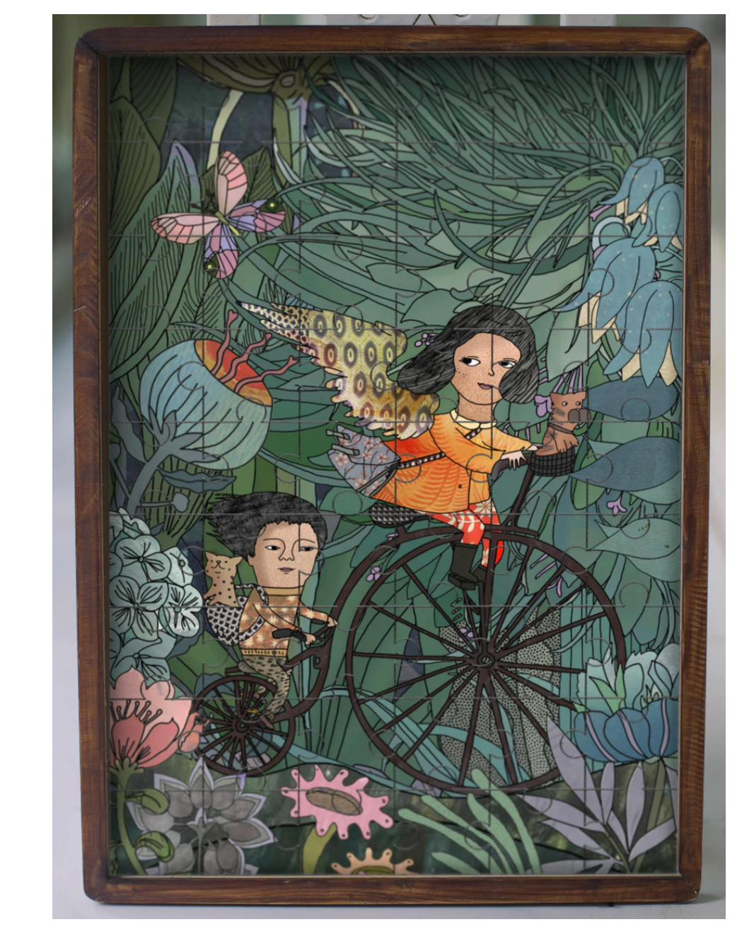 The 48 piece framed art puzzles are portraits of imaginary characters meant to delight and invite children into their whimsical realms. Framed in a teakwood tray, these puzzles can be hung on a wall after the puzzle has been assembled.
