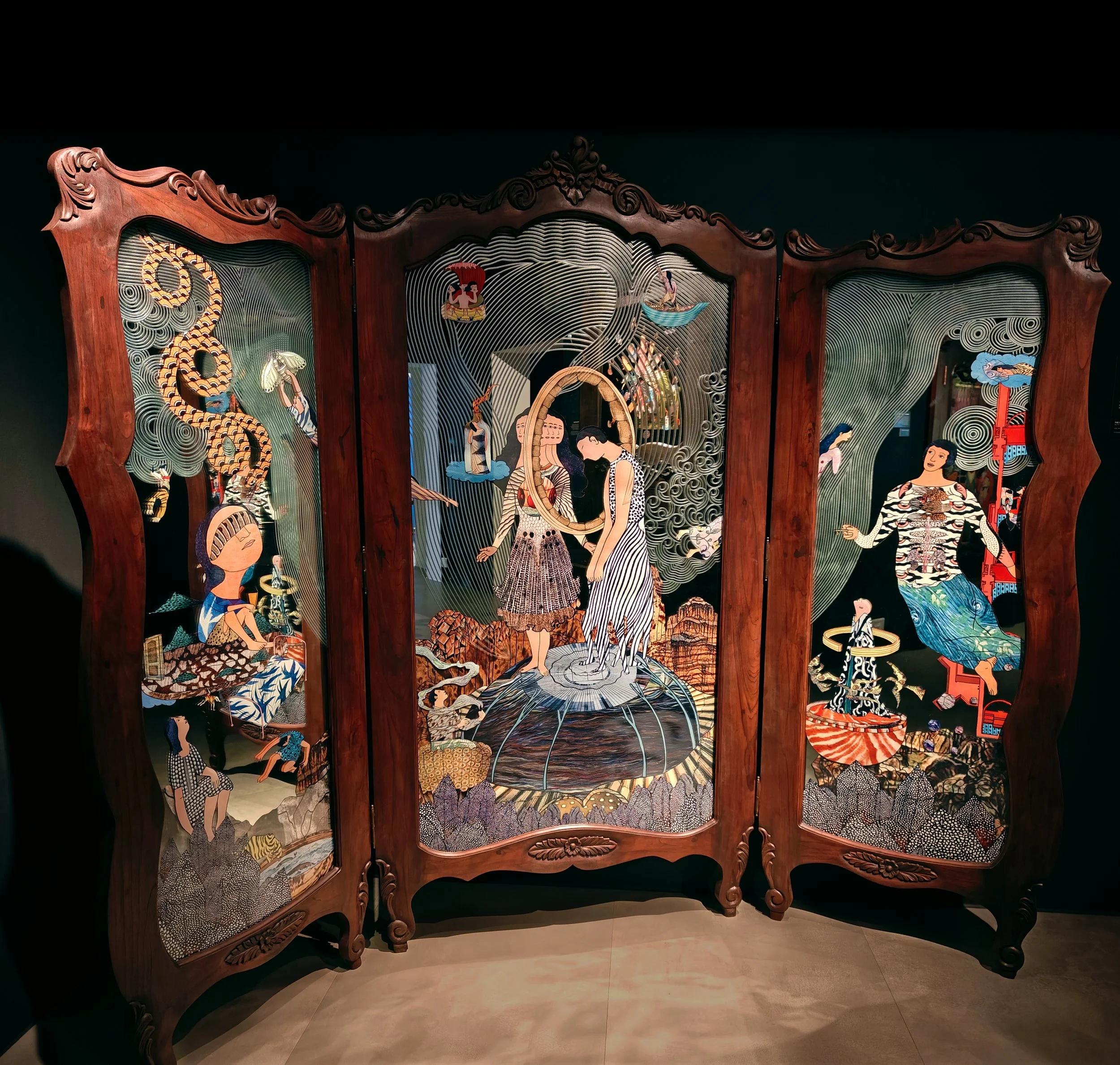 Medium: An assemblage of drawing and print on layers of plexiglass housed in reclaimed teak and bevelled glass.